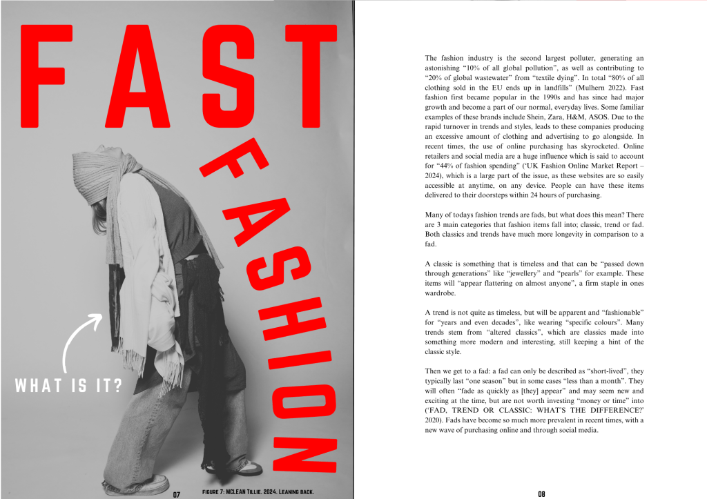This critical report investigates into the harsh realities of fast fashion and it’s negative impacts. Looking into the different demographics of fast fashion users and into sustainable brands, like DEPOP.