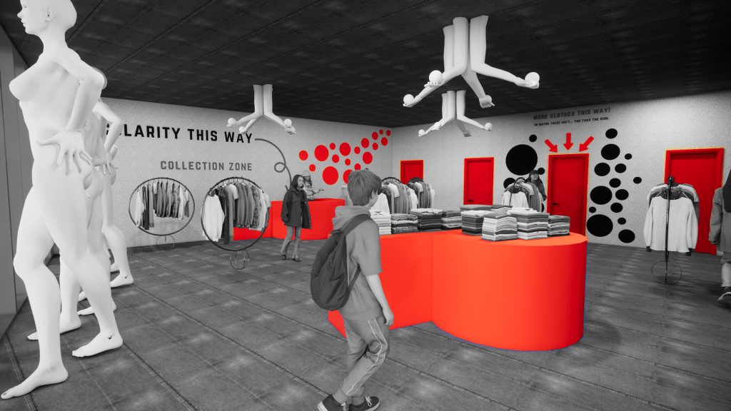 This project explores the realities of fast fashion through representing how short cycle clothing is impacting our environment. Through luring the target audience in by appearing as a regular fast fashion store to then being transported to the shock reality. Leading into the understanding and the resolution, re-purposing and purchasing second hand clothing with DEPOP.